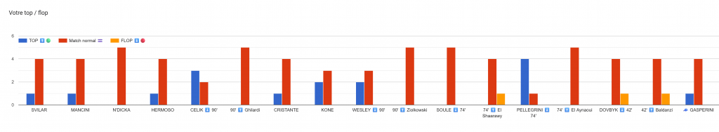 Pas de flops sur ce match pour le AmoRoma CLUB. Les seuls joueurs à avoir obtenu des votes en flop sont : Baldanzi, El Shaarawy et Dovbyk. Mais ils ont pour chacun une majorité de ‘match normal’.
