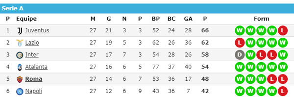 Dans le même temps, l’Atalanta mené sur sa pelouse 0-2 par la Lazio renverse les hommes de Inzaghi en l’emportant 3-2. L’Atalanta reste donc toujours à 6 points devant au classement.