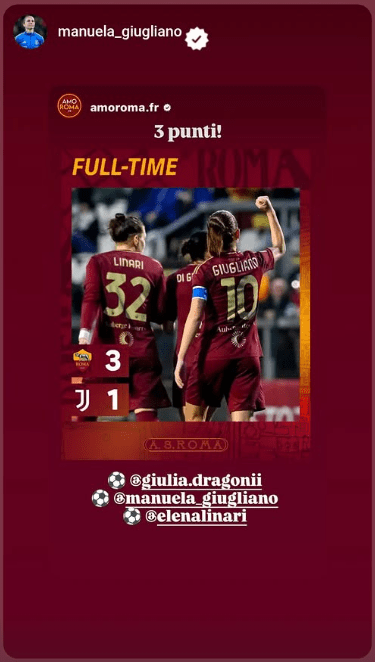 Buts : 3’ Dragoni (Roma), 59’ Bonansea (Juventus), 72’ Giugliano (Roma), 83’ Linari sur pénalty (Roma).