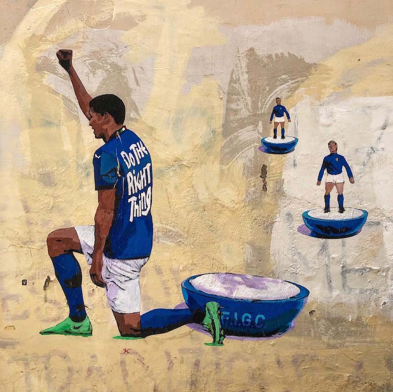 « la peinture murale sur Zaniolo qui est en fait une affiche, comme toutes les choses que j’ai fait jusqu’à présent, est née presque par hasard. Il était l’étoile montante du football italien. Il montrait des compétences extraordinaires et je l’ai donc interprété comme un jeune super-héros. Designer dans le costume pour le rendre plus actuel. Puis la blessure qui retenait nos rêves et ses rêves m’ont semblé une injustice du destin alors j’ai décidé de le mettre dans la rue. Avec l’espoir qu’il revienne plus fort qu’avant. »