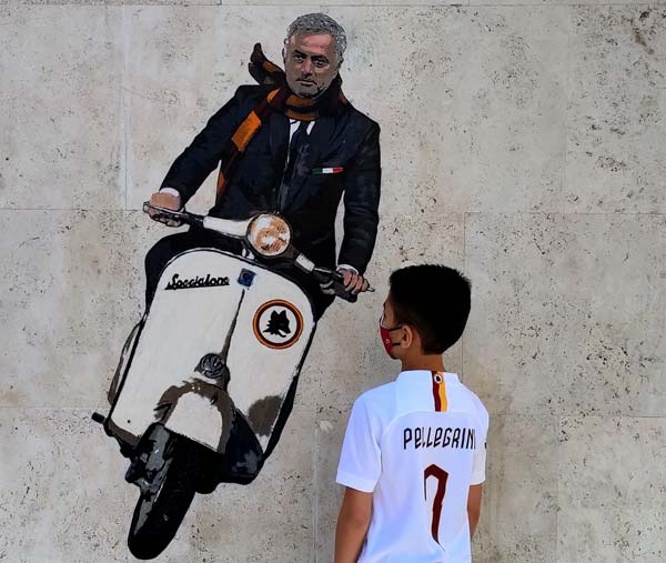 L’événement de l’été 2021, c’était sans doute l’engagement de José Mourinho avec l’AS ROMA. Mercredi 7 juillet, à Trigoria, Mourinho s’affiche sur une vespa pour remercier un artiste urbain, Harry greb.