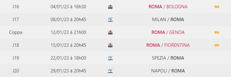 En Janvier, la Roma jouera 5 matchs de championnat et 1 match de Coppa Italia.