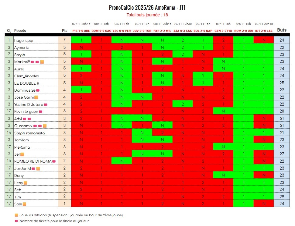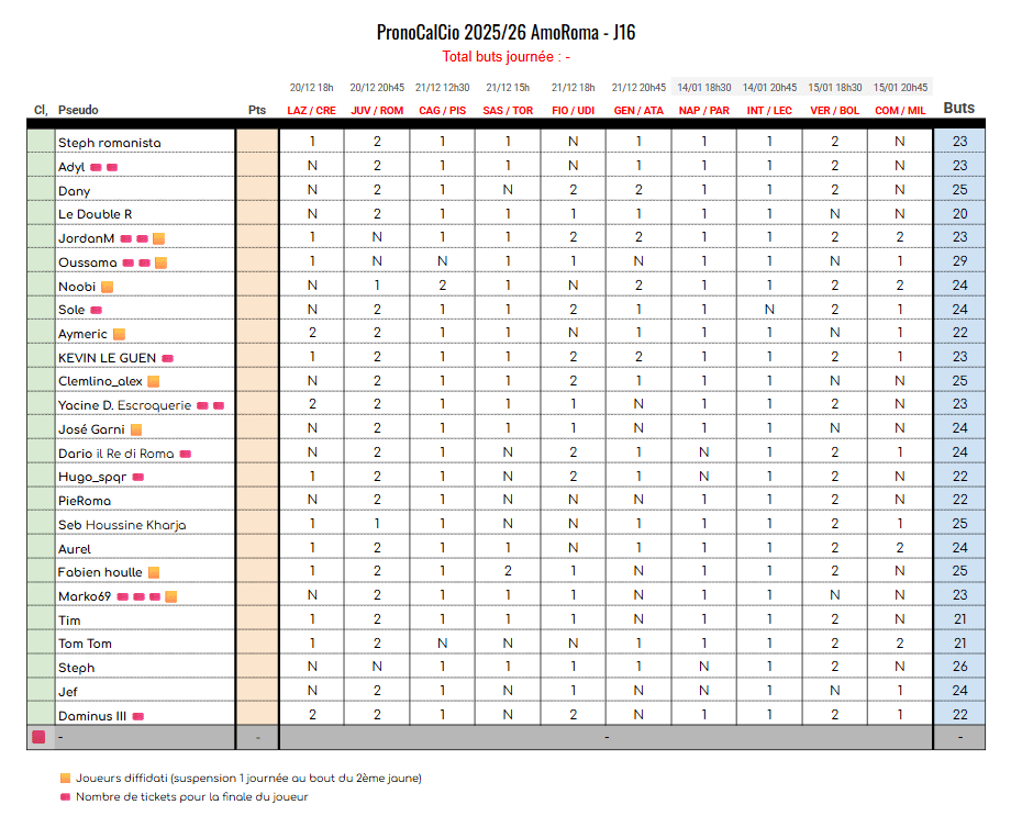 - La grille des pronostics sera affichée sur cette page avant le début du 1er match de la journée avec le nom du joueur et ses pronostics. Le .pdf sera également disponible dans le salon privé whatsapp PronoCalcio.