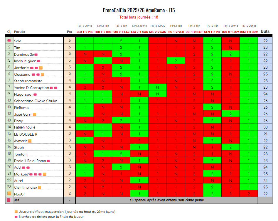 - Un 🟥 = suspension 1 match ! Le joueur pourra participer au prono Calcio de la journée suivante pour le fun mais il sera hors-classement et ne pourra prétendre ni à une victoire ni à un nouveau carton. Une fois la journée de suspension purgée, les cartons seront remis à 0 pour le joueur.