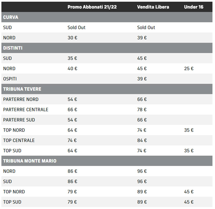 Nouveautés : Une personne ayant un abonnement 2021/22 peut acheter des billets à prix réduit pour ses amis romanisti (voir colonne Promo Abbonati 21/22). plus d’information sur le site officiel.